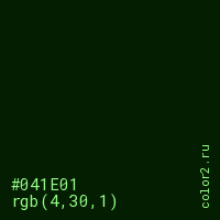 Цвет #041E01 в цветовой модели RGB обозначается тремя октетами (4, 30, 1) в десятичном формате и #041E01 в шестнадцатиричном (hex) формате, которые являются интенсивностью красного 4 (hex 04), интенсивность зелёного 30 (hex 1E) и интенсивность синего 1 (hex 01).