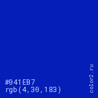 Цвет #041EB7 в цветовой модели RGB обозначается тремя октетами (4, 30, 183) в десятичном формате и #041EB7 в шестнадцатиричном (hex) формате, которые являются интенсивностью красного 4 (hex 04), интенсивность зелёного 30 (hex 1E) и интенсивность синего 183 (hex B7).