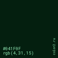 Цвет #041F0F в цветовой модели RGB обозначается тремя октетами (4, 31, 15) в десятичном формате и #041F0F в шестнадцатиричном (hex) формате, которые являются интенсивностью красного 4 (hex 04), интенсивность зелёного 31 (hex 1F) и интенсивность синего 15 (hex 0F).