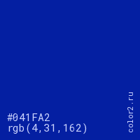 Цвет #041FA2 в цветовой модели RGB обозначается тремя октетами (4, 31, 162) в десятичном формате и #041FA2 в шестнадцатиричном (hex) формате, которые являются интенсивностью красного 4 (hex 04), интенсивность зелёного 31 (hex 1F) и интенсивность синего 162 (hex A2).