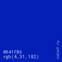 Цвет #041FB6 в цветовой модели RGB обозначается тремя октетами (4, 31, 182) в десятичном формате и #041FB6 в шестнадцатиричном (hex) формате, которые являются интенсивностью красного 4 (hex 04), интенсивность зелёного 31 (hex 1F) и интенсивность синего 182 (hex B6).
