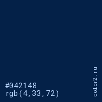 Цвет #042148 в цветовой модели RGB обозначается тремя октетами (4, 33, 72) в десятичном формате и #042148 в шестнадцатиричном (hex) формате, которые являются интенсивностью красного 4 (hex 04), интенсивность зелёного 33 (hex 21) и интенсивность синего 72 (hex 48).