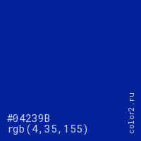 Цвет #04239B в цветовой модели RGB обозначается тремя октетами (4, 35, 155) в десятичном формате и #04239B в шестнадцатиричном (hex) формате, которые являются интенсивностью красного 4 (hex 04), интенсивность зелёного 35 (hex 23) и интенсивность синего 155 (hex 9B).