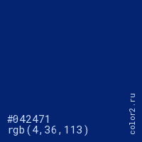 Цвет #042471 в цветовой модели RGB обозначается тремя октетами (4, 36, 113) в десятичном формате и #042471 в шестнадцатиричном (hex) формате, которые являются интенсивностью красного 4 (hex 04), интенсивность зелёного 36 (hex 24) и интенсивность синего 113 (hex 71).