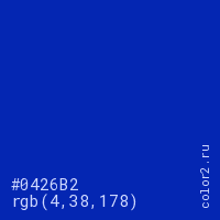 Цвет #0426B2 в цветовой модели RGB обозначается тремя октетами (4, 38, 178) в десятичном формате и #0426B2 в шестнадцатиричном (hex) формате, которые являются интенсивностью красного 4 (hex 04), интенсивность зелёного 38 (hex 26) и интенсивность синего 178 (hex B2).