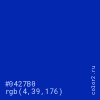 Цвет #0427B0 в цветовой модели RGB обозначается тремя октетами (4, 39, 176) в десятичном формате и #0427B0 в шестнадцатиричном (hex) формате, которые являются интенсивностью красного 4 (hex 04), интенсивность зелёного 39 (hex 27) и интенсивность синего 176 (hex B0).