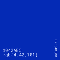 Цвет #042AB5 в цветовой модели RGB обозначается тремя октетами (4, 42, 181) в десятичном формате и #042AB5 в шестнадцатиричном (hex) формате, которые являются интенсивностью красного 4 (hex 04), интенсивность зелёного 42 (hex 2A) и интенсивность синего 181 (hex B5).