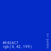 Цвет #042AC7 в цветовой модели RGB обозначается тремя октетами (4, 42, 199) в десятичном формате и #042AC7 в шестнадцатиричном (hex) формате, которые являются интенсивностью красного 4 (hex 04), интенсивность зелёного 42 (hex 2A) и интенсивность синего 199 (hex C7).