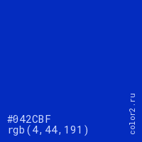 Цвет #042CBF в цветовой модели RGB обозначается тремя октетами (4, 44, 191) в десятичном формате и #042CBF в шестнадцатиричном (hex) формате, которые являются интенсивностью красного 4 (hex 04), интенсивность зелёного 44 (hex 2C) и интенсивность синего 191 (hex BF).