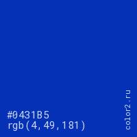 Цвет #0431B5 в цветовой модели RGB обозначается тремя октетами (4, 49, 181) в десятичном формате и #0431B5 в шестнадцатиричном (hex) формате, которые являются интенсивностью красного 4 (hex 04), интенсивность зелёного 49 (hex 31) и интенсивность синего 181 (hex B5).