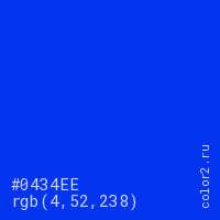 Цвет #0434EE в цветовой модели RGB обозначается тремя октетами (4, 52, 238) в десятичном формате и #0434EE в шестнадцатиричном (hex) формате, которые являются интенсивностью красного 4 (hex 04), интенсивность зелёного 52 (hex 34) и интенсивность синего 238 (hex EE).