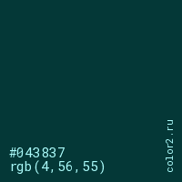 Цвет #043837 в цветовой модели RGB обозначается тремя октетами (4, 56, 55) в десятичном формате и #043837 в шестнадцатиричном (hex) формате, которые являются интенсивностью красного 4 (hex 04), интенсивность зелёного 56 (hex 38) и интенсивность синего 55 (hex 37).