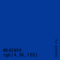 Цвет #043899 в цветовой модели RGB обозначается тремя октетами (4, 56, 153) в десятичном формате и #043899 в шестнадцатиричном (hex) формате, которые являются интенсивностью красного 4 (hex 04), интенсивность зелёного 56 (hex 38) и интенсивность синего 153 (hex 99).