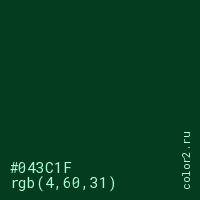 Цвет #043C1F в цветовой модели RGB обозначается тремя октетами (4, 60, 31) в десятичном формате и #043C1F в шестнадцатиричном (hex) формате, которые являются интенсивностью красного 4 (hex 04), интенсивность зелёного 60 (hex 3C) и интенсивность синего 31 (hex 1F).