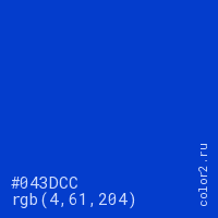 Цвет #043DCC в цветовой модели RGB обозначается тремя октетами (4, 61, 204) в десятичном формате и #043DCC в шестнадцатиричном (hex) формате, которые являются интенсивностью красного 4 (hex 04), интенсивность зелёного 61 (hex 3D) и интенсивность синего 204 (hex CC).