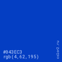 Цвет #043EC3 в цветовой модели RGB обозначается тремя октетами (4, 62, 195) в десятичном формате и #043EC3 в шестнадцатиричном (hex) формате, которые являются интенсивностью красного 4 (hex 04), интенсивность зелёного 62 (hex 3E) и интенсивность синего 195 (hex C3).