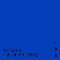 Цвет #043FB9 в цветовой модели RGB обозначается тремя октетами (4, 63, 185) в десятичном формате и #043FB9 в шестнадцатиричном (hex) формате, которые являются интенсивностью красного 4 (hex 04), интенсивность зелёного 63 (hex 3F) и интенсивность синего 185 (hex B9).