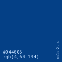 Цвет #044086 в цветовой модели RGB обозначается тремя октетами (4, 64, 134) в десятичном формате и #044086 в шестнадцатиричном (hex) формате, которые являются интенсивностью красного 4 (hex 04), интенсивность зелёного 64 (hex 40) и интенсивность синего 134 (hex 86).