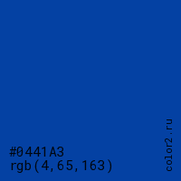 Цвет #0441A3 в цветовой модели RGB обозначается тремя октетами (4, 65, 163) в десятичном формате и #0441A3 в шестнадцатиричном (hex) формате, которые являются интенсивностью красного 4 (hex 04), интенсивность зелёного 65 (hex 41) и интенсивность синего 163 (hex A3).
