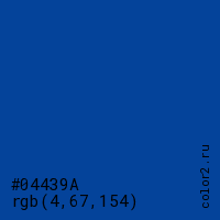 Цвет #04439A в цветовой модели RGB обозначается тремя октетами (4, 67, 154) в десятичном формате и #04439A в шестнадцатиричном (hex) формате, которые являются интенсивностью красного 4 (hex 04), интенсивность зелёного 67 (hex 43) и интенсивность синего 154 (hex 9A).
