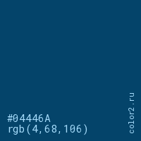 Цвет #04446A в цветовой модели RGB обозначается тремя октетами (4, 68, 106) в десятичном формате и #04446A в шестнадцатиричном (hex) формате, которые являются интенсивностью красного 4 (hex 04), интенсивность зелёного 68 (hex 44) и интенсивность синего 106 (hex 6A).