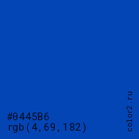 Цвет #0445B6 в цветовой модели RGB обозначается тремя октетами (4, 69, 182) в десятичном формате и #0445B6 в шестнадцатиричном (hex) формате, которые являются интенсивностью красного 4 (hex 04), интенсивность зелёного 69 (hex 45) и интенсивность синего 182 (hex B6).