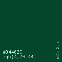 Цвет #04462C в цветовой модели RGB обозначается тремя октетами (4, 70, 44) в десятичном формате и #04462C в шестнадцатиричном (hex) формате, которые являются интенсивностью красного 4 (hex 04), интенсивность зелёного 70 (hex 46) и интенсивность синего 44 (hex 2C).