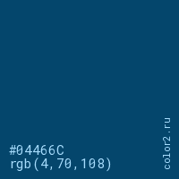 Цвет #04466C в цветовой модели RGB обозначается тремя октетами (4, 70, 108) в десятичном формате и #04466C в шестнадцатиричном (hex) формате, которые являются интенсивностью красного 4 (hex 04), интенсивность зелёного 70 (hex 46) и интенсивность синего 108 (hex 6C).