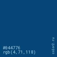 Цвет #044776 в цветовой модели RGB обозначается тремя октетами (4, 71, 118) в десятичном формате и #044776 в шестнадцатиричном (hex) формате, которые являются интенсивностью красного 4 (hex 04), интенсивность зелёного 71 (hex 47) и интенсивность синего 118 (hex 76).