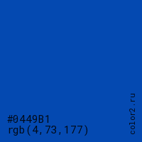 Цвет #0449B1 в цветовой модели RGB обозначается тремя октетами (4, 73, 177) в десятичном формате и #0449B1 в шестнадцатиричном (hex) формате, которые являются интенсивностью красного 4 (hex 04), интенсивность зелёного 73 (hex 49) и интенсивность синего 177 (hex B1).