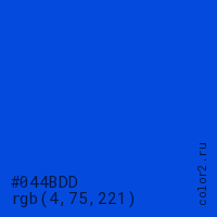 Цвет #044BDD в цветовой модели RGB обозначается тремя октетами (4, 75, 221) в десятичном формате и #044BDD в шестнадцатиричном (hex) формате, которые являются интенсивностью красного 4 (hex 04), интенсивность зелёного 75 (hex 4B) и интенсивность синего 221 (hex DD).