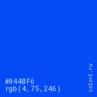 Цвет #044BF6 в цветовой модели RGB обозначается тремя октетами (4, 75, 246) в десятичном формате и #044BF6 в шестнадцатиричном (hex) формате, которые являются интенсивностью красного 4 (hex 04), интенсивность зелёного 75 (hex 4B) и интенсивность синего 246 (hex F6).