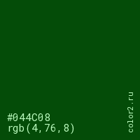 Цвет #044C08 в цветовой модели RGB обозначается тремя октетами (4, 76, 8) в десятичном формате и #044C08 в шестнадцатиричном (hex) формате, которые являются интенсивностью красного 4 (hex 04), интенсивность зелёного 76 (hex 4C) и интенсивность синего 8 (hex 08).