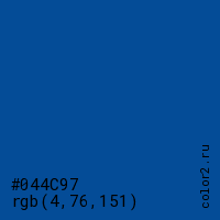Цвет #044C97 в цветовой модели RGB обозначается тремя октетами (4, 76, 151) в десятичном формате и #044C97 в шестнадцатиричном (hex) формате, которые являются интенсивностью красного 4 (hex 04), интенсивность зелёного 76 (hex 4C) и интенсивность синего 151 (hex 97).