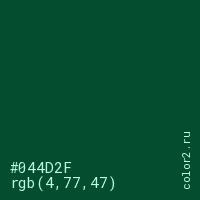 Цвет #044D2F в цветовой модели RGB обозначается тремя октетами (4, 77, 47) в десятичном формате и #044D2F в шестнадцатиричном (hex) формате, которые являются интенсивностью красного 4 (hex 04), интенсивность зелёного 77 (hex 4D) и интенсивность синего 47 (hex 2F).