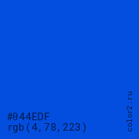 Цвет #044EDF в цветовой модели RGB обозначается тремя октетами (4, 78, 223) в десятичном формате и #044EDF в шестнадцатиричном (hex) формате, которые являются интенсивностью красного 4 (hex 04), интенсивность зелёного 78 (hex 4E) и интенсивность синего 223 (hex DF).