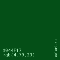 Цвет #044F17 в цветовой модели RGB обозначается тремя октетами (4, 79, 23) в десятичном формате и #044F17 в шестнадцатиричном (hex) формате, которые являются интенсивностью красного 4 (hex 04), интенсивность зелёного 79 (hex 4F) и интенсивность синего 23 (hex 17).