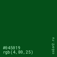 Цвет #045019 в цветовой модели RGB обозначается тремя октетами (4, 80, 25) в десятичном формате и #045019 в шестнадцатиричном (hex) формате, которые являются интенсивностью красного 4 (hex 04), интенсивность зелёного 80 (hex 50) и интенсивность синего 25 (hex 19).
