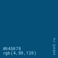 Цвет #045078 в цветовой модели RGB обозначается тремя октетами (4, 80, 120) в десятичном формате и #045078 в шестнадцатиричном (hex) формате, которые являются интенсивностью красного 4 (hex 04), интенсивность зелёного 80 (hex 50) и интенсивность синего 120 (hex 78).