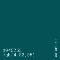 Цвет #045255 в цветовой модели RGB обозначается тремя октетами (4, 82, 85) в десятичном формате и #045255 в шестнадцатиричном (hex) формате, которые являются интенсивностью красного 4 (hex 04), интенсивность зелёного 82 (hex 52) и интенсивность синего 85 (hex 55).