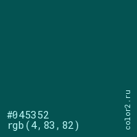 Цвет #045352 в цветовой модели RGB обозначается тремя октетами (4, 83, 82) в десятичном формате и #045352 в шестнадцатиричном (hex) формате, которые являются интенсивностью красного 4 (hex 04), интенсивность зелёного 83 (hex 53) и интенсивность синего 82 (hex 52).