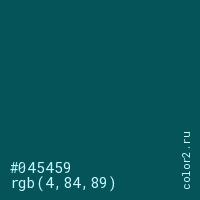 Цвет #045459 в цветовой модели RGB обозначается тремя октетами (4, 84, 89) в десятичном формате и #045459 в шестнадцатиричном (hex) формате, которые являются интенсивностью красного 4 (hex 04), интенсивность зелёного 84 (hex 54) и интенсивность синего 89 (hex 59).