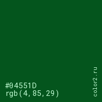 Цвет #04551D в цветовой модели RGB обозначается тремя октетами (4, 85, 29) в десятичном формате и #04551D в шестнадцатиричном (hex) формате, которые являются интенсивностью красного 4 (hex 04), интенсивность зелёного 85 (hex 55) и интенсивность синего 29 (hex 1D).