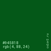 Цвет #045818 в цветовой модели RGB обозначается тремя октетами (4, 88, 24) в десятичном формате и #045818 в шестнадцатиричном (hex) формате, которые являются интенсивностью красного 4 (hex 04), интенсивность зелёного 88 (hex 58) и интенсивность синего 24 (hex 18).