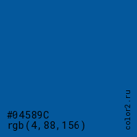 Цвет #04589C в цветовой модели RGB обозначается тремя октетами (4, 88, 156) в десятичном формате и #04589C в шестнадцатиричном (hex) формате, которые являются интенсивностью красного 4 (hex 04), интенсивность зелёного 88 (hex 58) и интенсивность синего 156 (hex 9C).