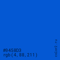 Цвет #0458D3 в цветовой модели RGB обозначается тремя октетами (4, 88, 211) в десятичном формате и #0458D3 в шестнадцатиричном (hex) формате, которые являются интенсивностью красного 4 (hex 04), интенсивность зелёного 88 (hex 58) и интенсивность синего 211 (hex D3).