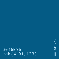 Цвет #045B85 в цветовой модели RGB обозначается тремя октетами (4, 91, 133) в десятичном формате и #045B85 в шестнадцатиричном (hex) формате, которые являются интенсивностью красного 4 (hex 04), интенсивность зелёного 91 (hex 5B) и интенсивность синего 133 (hex 85).