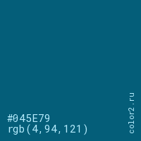 Цвет #045E79 в цветовой модели RGB обозначается тремя октетами (4, 94, 121) в десятичном формате и #045E79 в шестнадцатиричном (hex) формате, которые являются интенсивностью красного 4 (hex 04), интенсивность зелёного 94 (hex 5E) и интенсивность синего 121 (hex 79).