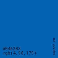 Цвет #0462B3 в цветовой модели RGB обозначается тремя октетами (4, 98, 179) в десятичном формате и #0462B3 в шестнадцатиричном (hex) формате, которые являются интенсивностью красного 4 (hex 04), интенсивность зелёного 98 (hex 62) и интенсивность синего 179 (hex B3).