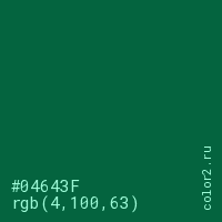 Цвет #04643F в цветовой модели RGB обозначается тремя октетами (4, 100, 63) в десятичном формате и #04643F в шестнадцатиричном (hex) формате, которые являются интенсивностью красного 4 (hex 04), интенсивность зелёного 100 (hex 64) и интенсивность синего 63 (hex 3F).